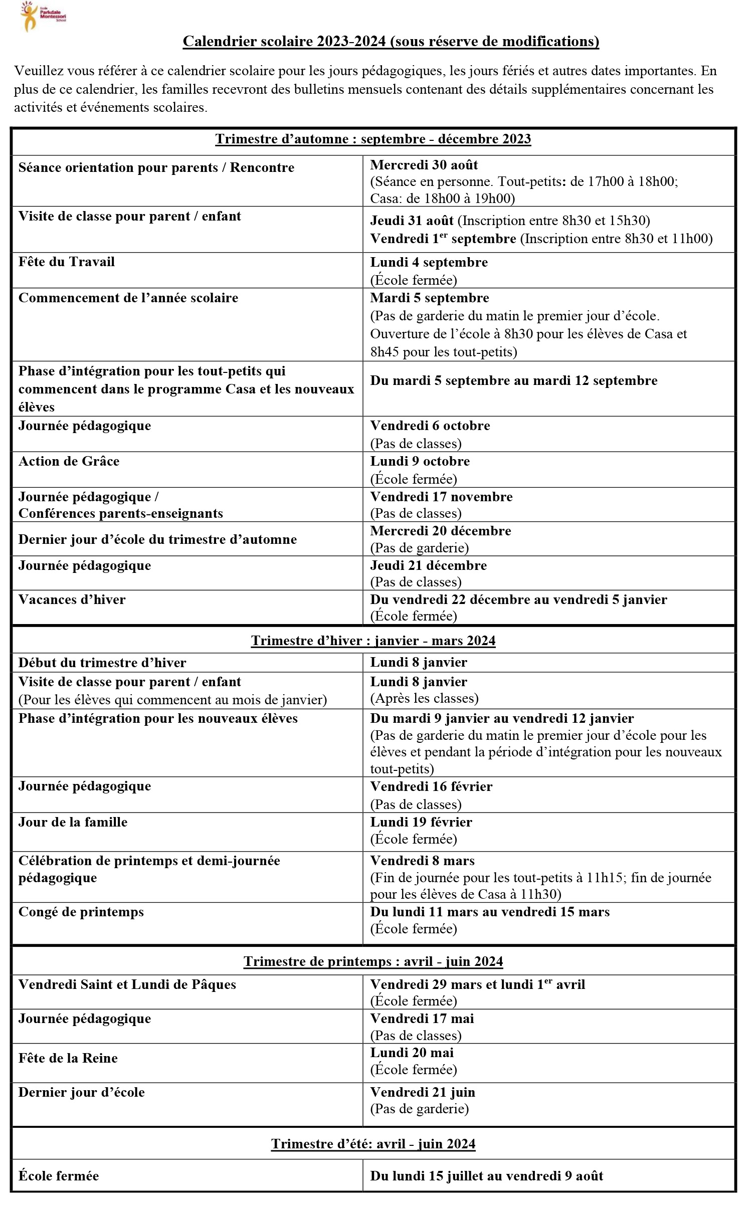 Cliquez pour télécharger une version PDF du calendrier scolaire 2023-2024.